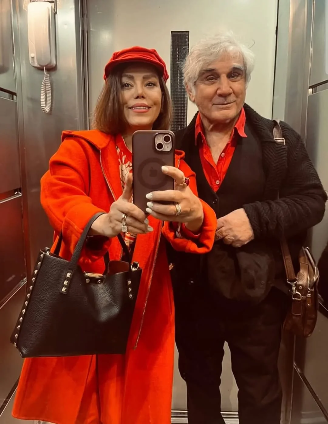 عکس| مهدی هاشمی و زن جوانش؛ همسر آقای بازیگر با پالتو قرمز جلب توجه کرد
