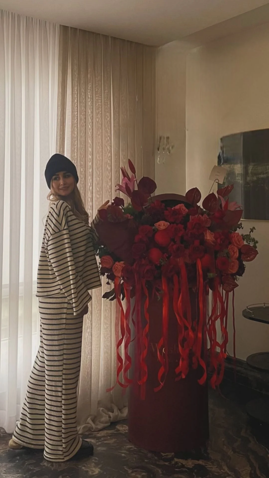 همسر شاهرخ استخری با دسته گل هم قد خودش؛ سپیده بزمی پور با استایل گورخری