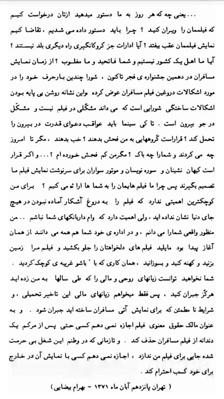 در نامهی آبان ۱۳۷۱ به وزارت فرهنگ و ارشاد اسلامی، بیضایی با لحنی که هم خونسرد است و هم برنده، سازوکار واقعی سانسور را افشا میکند؛ سانسوری که خود را پشت واژههایی چون «تعویق»، «مصلحت» و «بررسی مجدد» پنهان میکند. او صریح میپرسد: «یعنی چه که هر روز به ما دستور میدهید ازتان درخواست کنیم که فیلممان را ویران کنید؟ چرا باید دستور داده میشد، تقاضا کنیم نمایش فیلممان عقب بیفتد؟» این پرسش، نه اعتراض به یک تصمیم، بلکه حمله به منطقی است که حذف را به خواستِ خودِ حذفشونده بدل میکند.