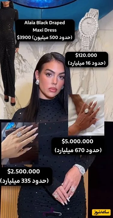 به گزارش سرویس ورزش پلاس و به نقل از ساعدنیوز، جورجینا پیراهنی از برند Alaïa بر تن داشت؛ مدلی که پیشتر نیز نسخهی سبزرنگ آن بر تن او دیده شده بود و قیمتی در حدود 3٬900 دلار دارد. با این حال، برجستهترین و چشمگیرترین بخش این استایل، جواهرات او بود.