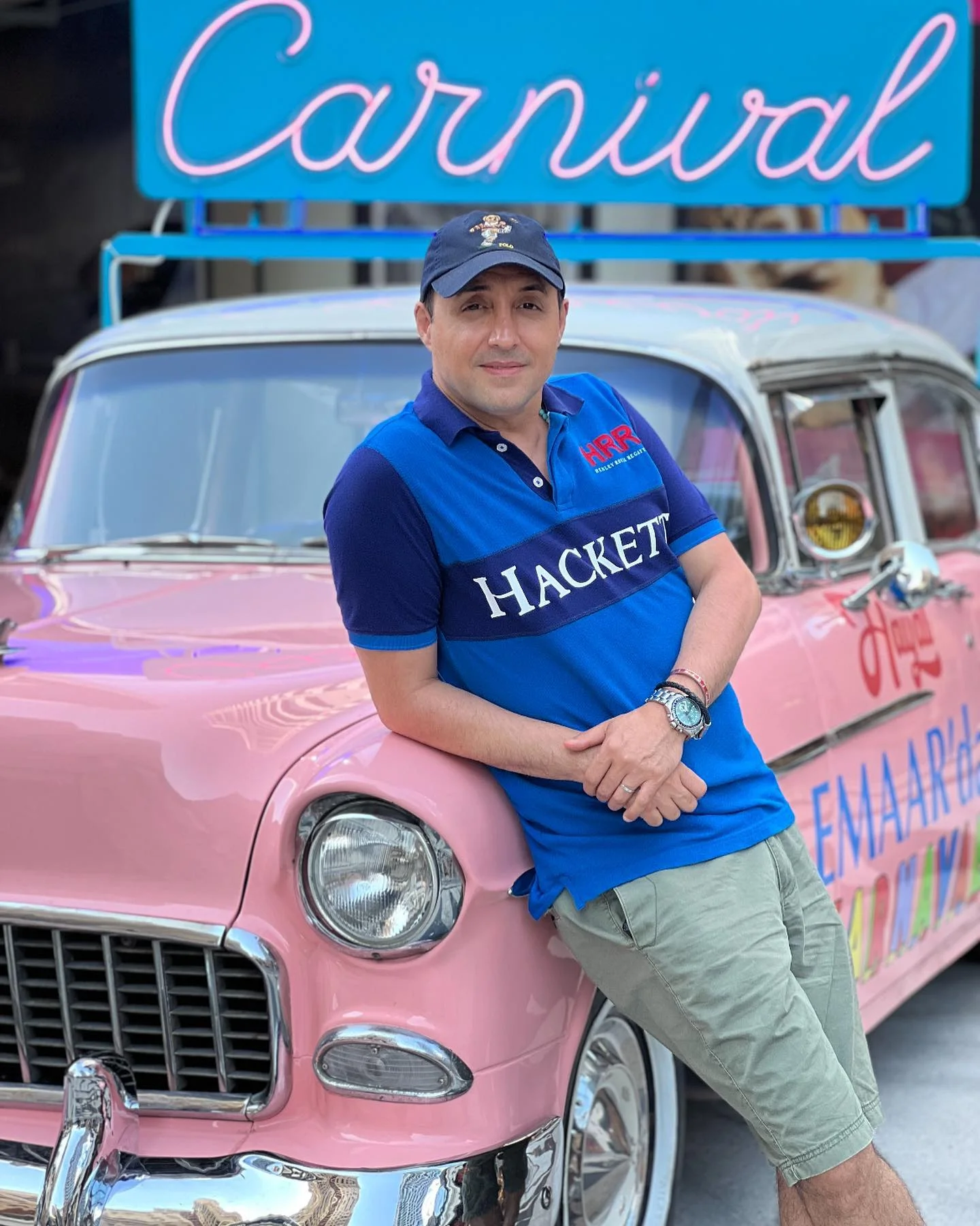 امیرحسین رستمی کنار ماشین فانتزی و صورتی با شلوارک؛ عجب جای بامزهای هست