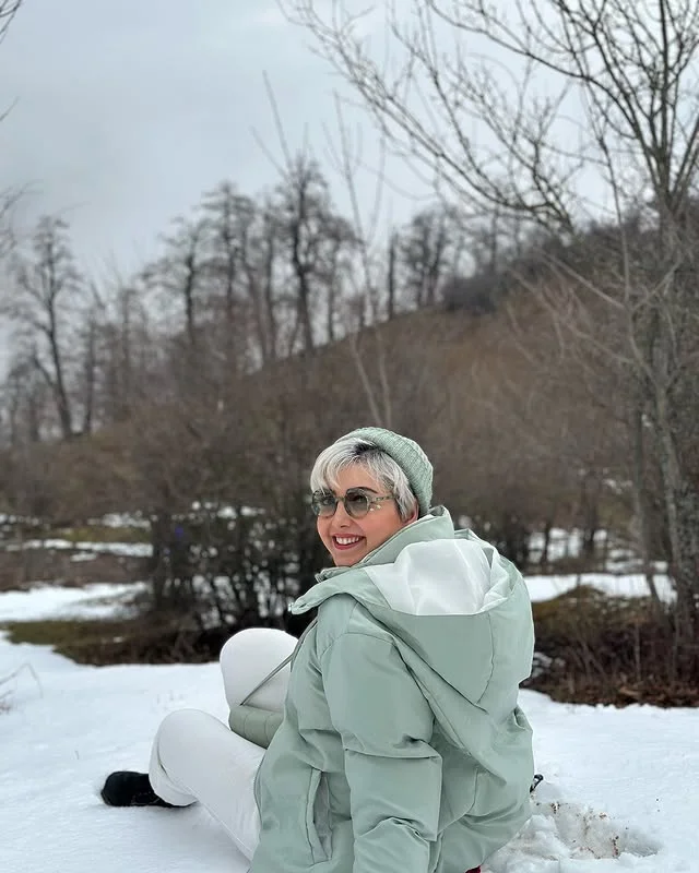 استایل سبز و سفید زیبا کرمعلی وسط برفا تو شمال؛ خانم بازیگر چه کیفی میکنه