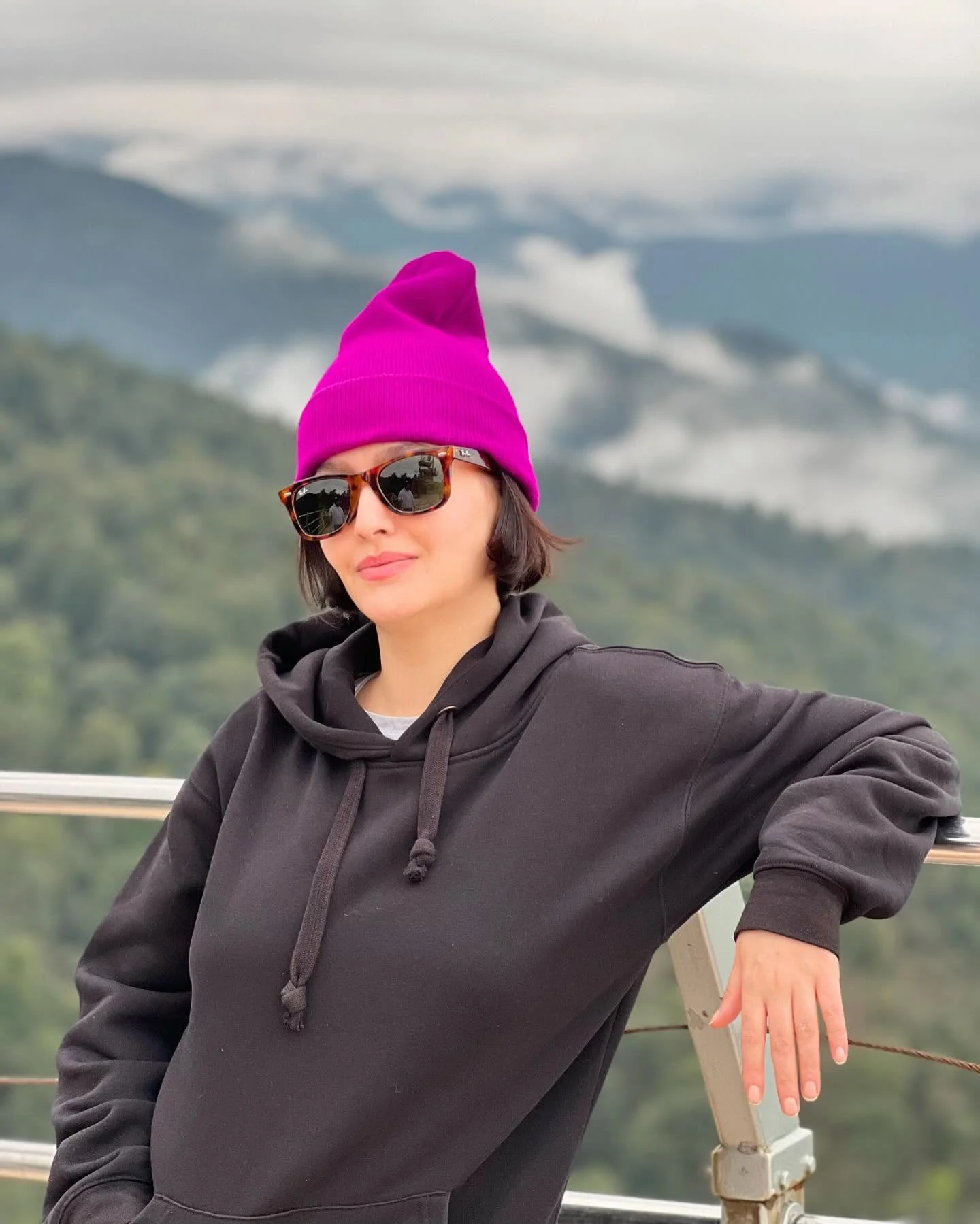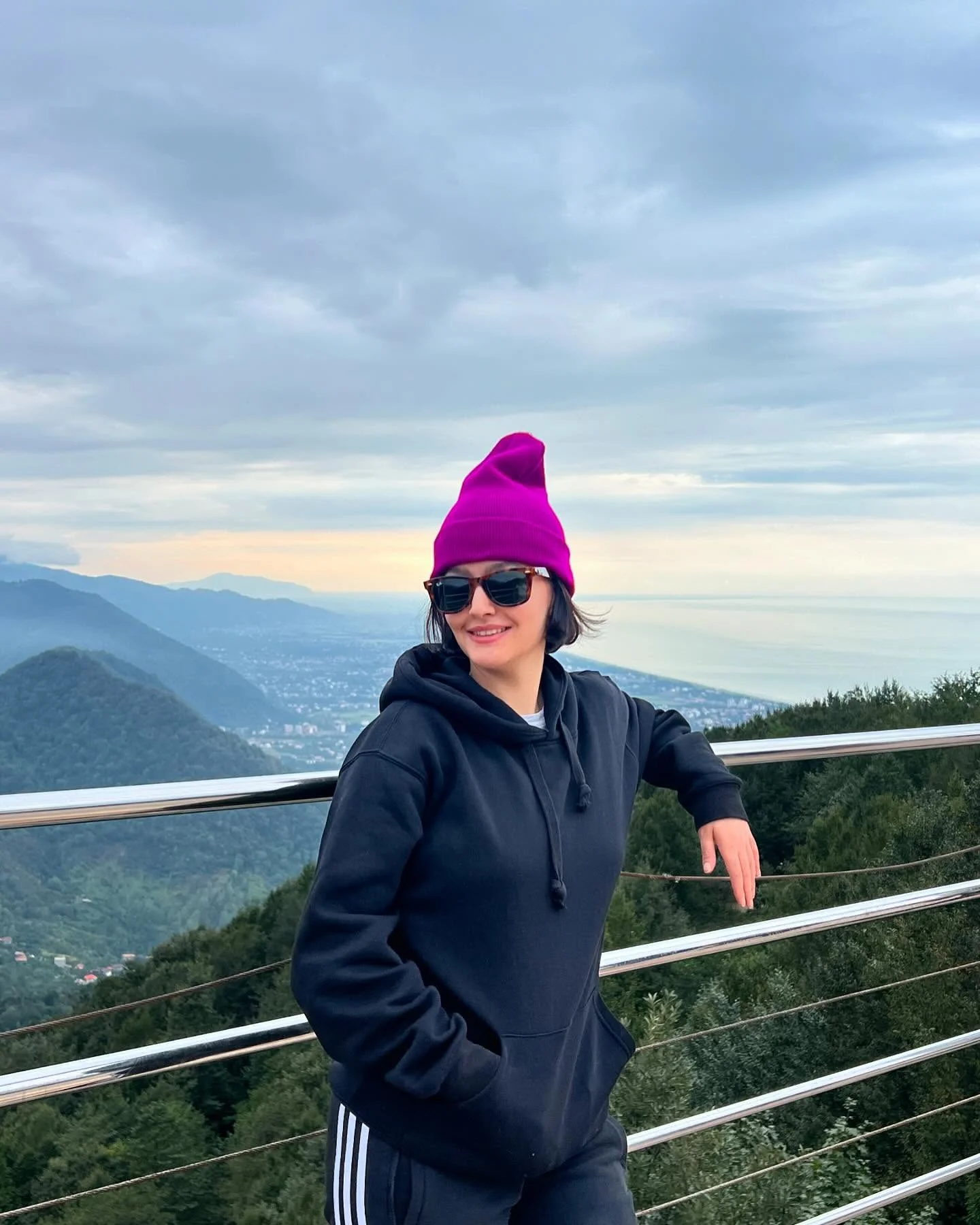 پردیس احمدیه با هودی مشکی و کلاه عجیب بنفش در شمال؛ چقدر بامزه و ناز شده