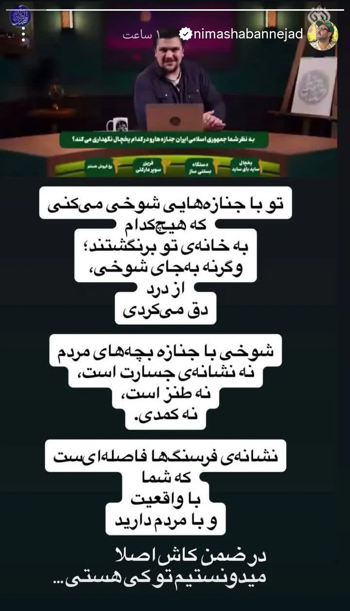 - واکنش جنجالی نیما شعبان نژاد به مجری افق؛ کاش میدونستم کی هستی ۱۴۰۴/۱۱/۱۳