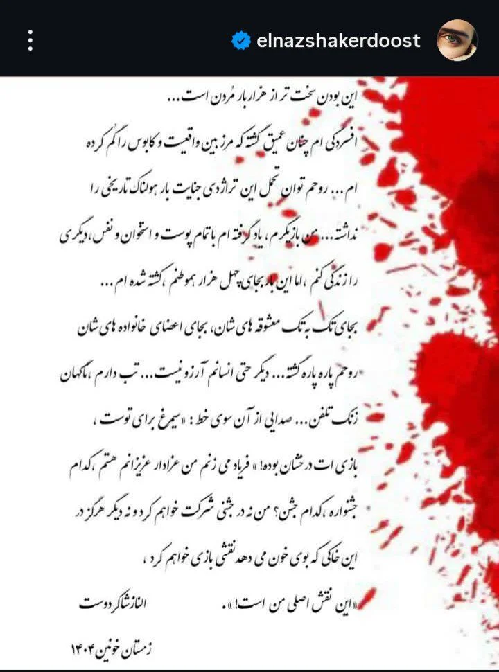 - واکنش غم انگیز الناز شاکردوست به مردم؛ کدام جشنواره؟ کدام جشن؟ ۱۴۰۴/۱۱/۱۴