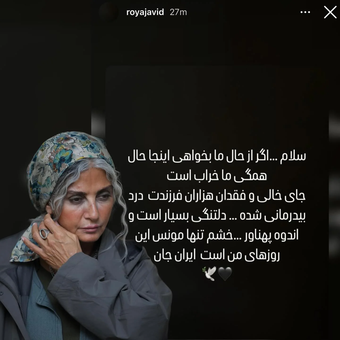 - استوری دردناک رویا جاویدنیا بازیگر سینما / حال همگی ما خراب است ۱۴۰۴/۱۱/۱۴