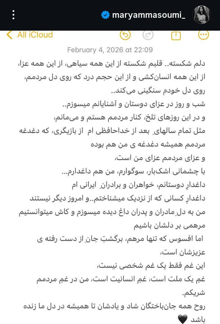 - استوری| همدردی مریم معصومی با داغداران؛ من در غم مردمم شریکم ۱۴۰۴/۱۱/۱۶