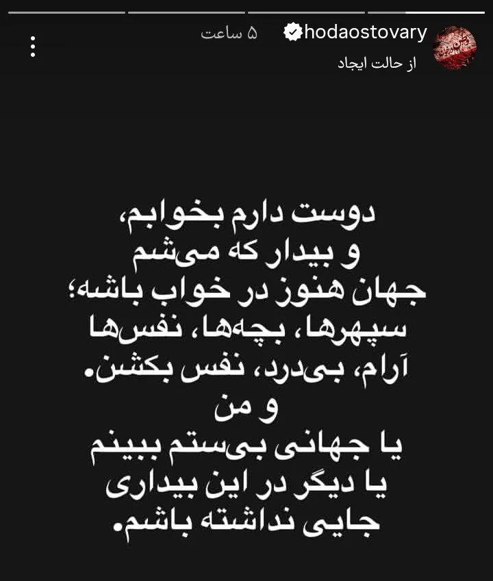 - عکس| هدی استواری: میخوام بخوابم و بیدار شم دنیایی بی ستم ببینم ۱۴۰۴/۱۱/۱۹
