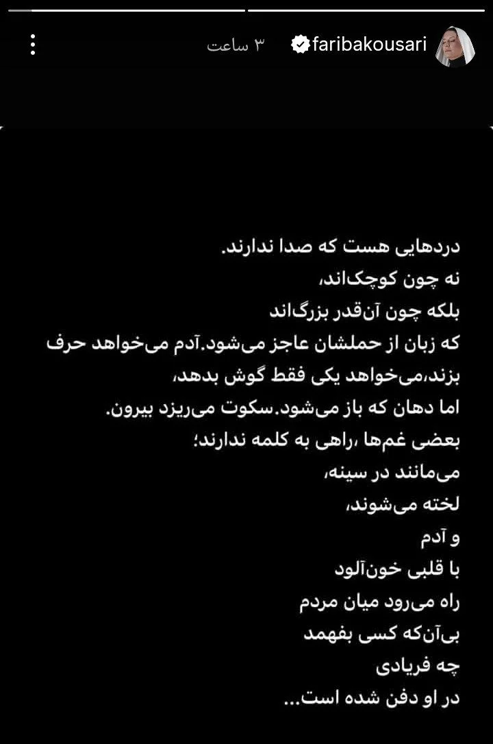 - استوری تلخ فریبا کوثری؛ دردی بیصدا دارم… ۱۴۰۴/۱۱/۱۹