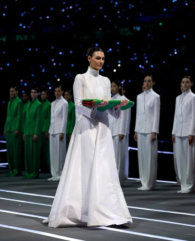 او موهایش را گوجهای بست تا تمرکز کامل روی طراحی لباس و نمادگرایی حضورش باشد، و با گامهایی مطمئن پرچم ملی را به نیروهای تشریفاتی تحویل داد.