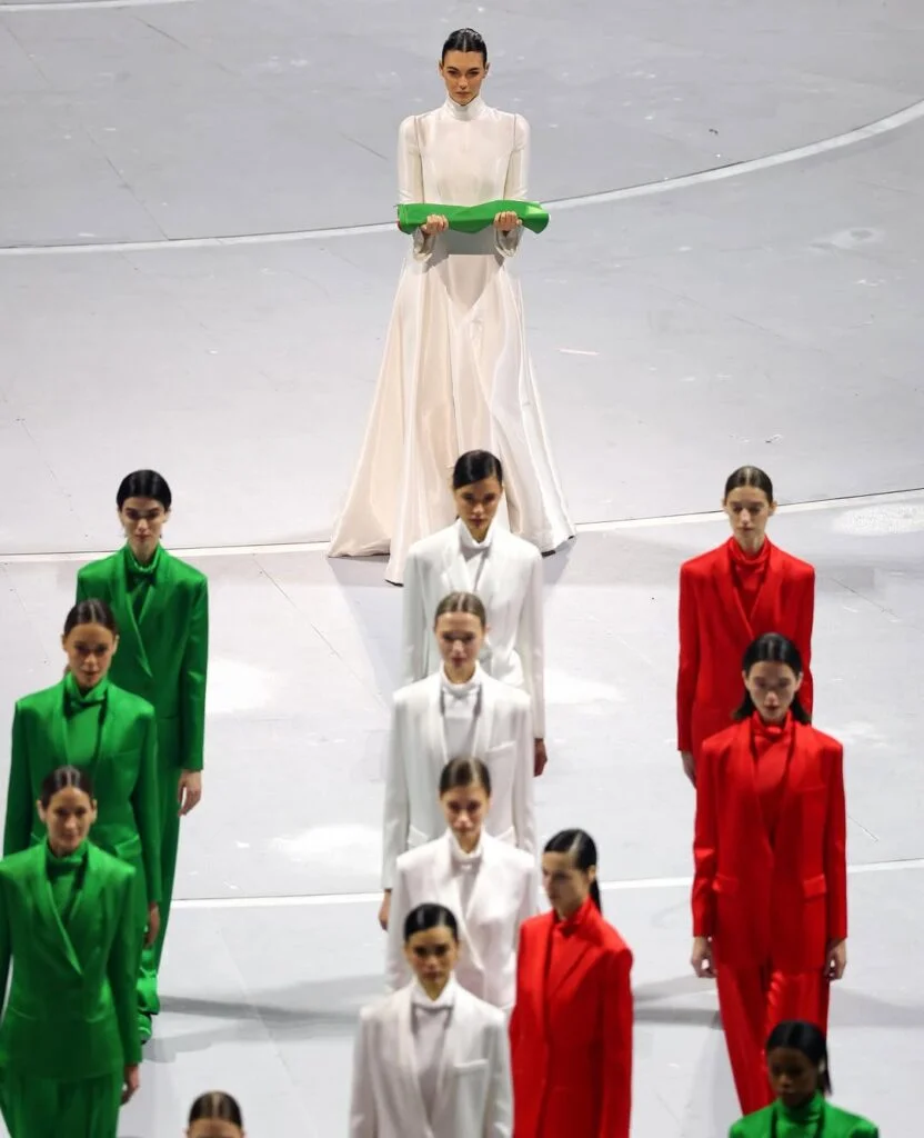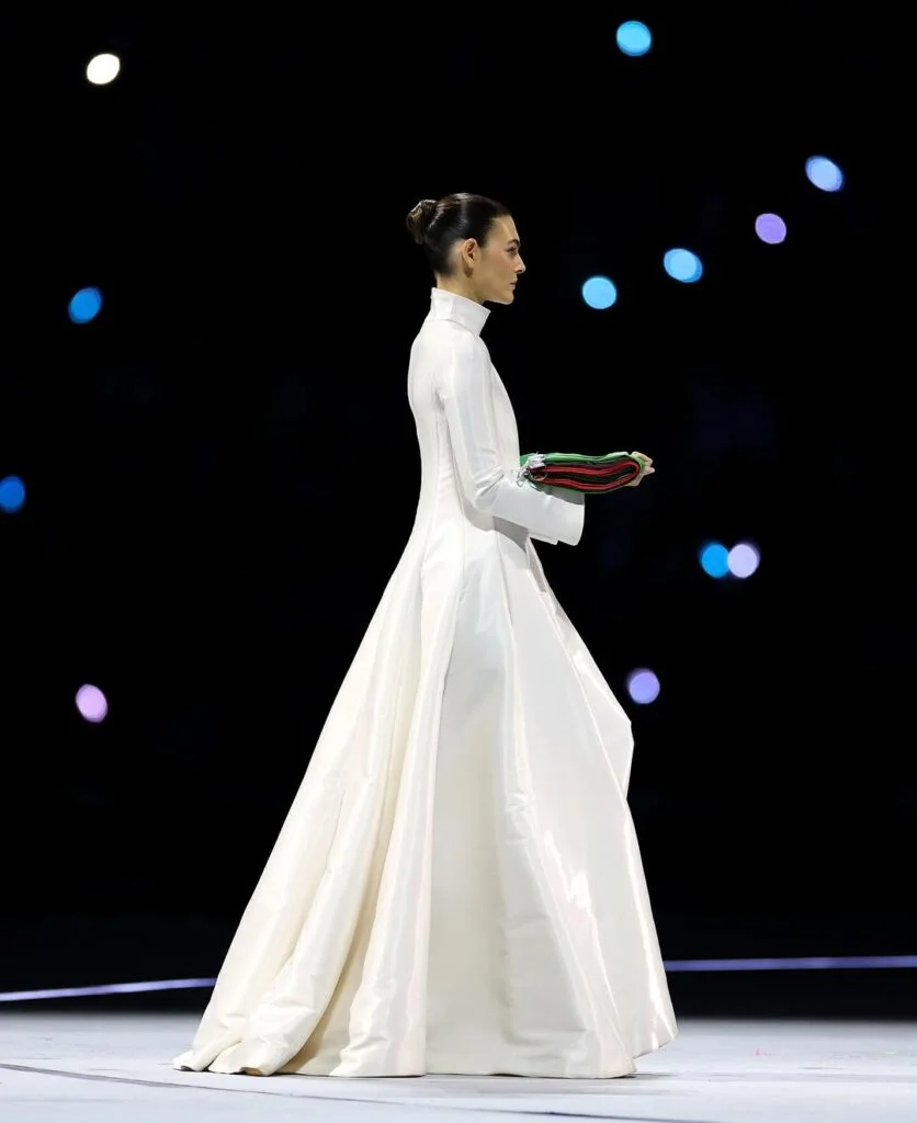 سرتی، که یکی از حاملان پرچم ایتالیا بود، با لباسی سفارشی از Armani Privé در افتتاحیه ظاهر شد؛ پیراهنی سفید، بلند تا زمین با یقه بلند و آستینهای چشمگیر که جلوهای باشکوه و تمیز به استایلش داد.