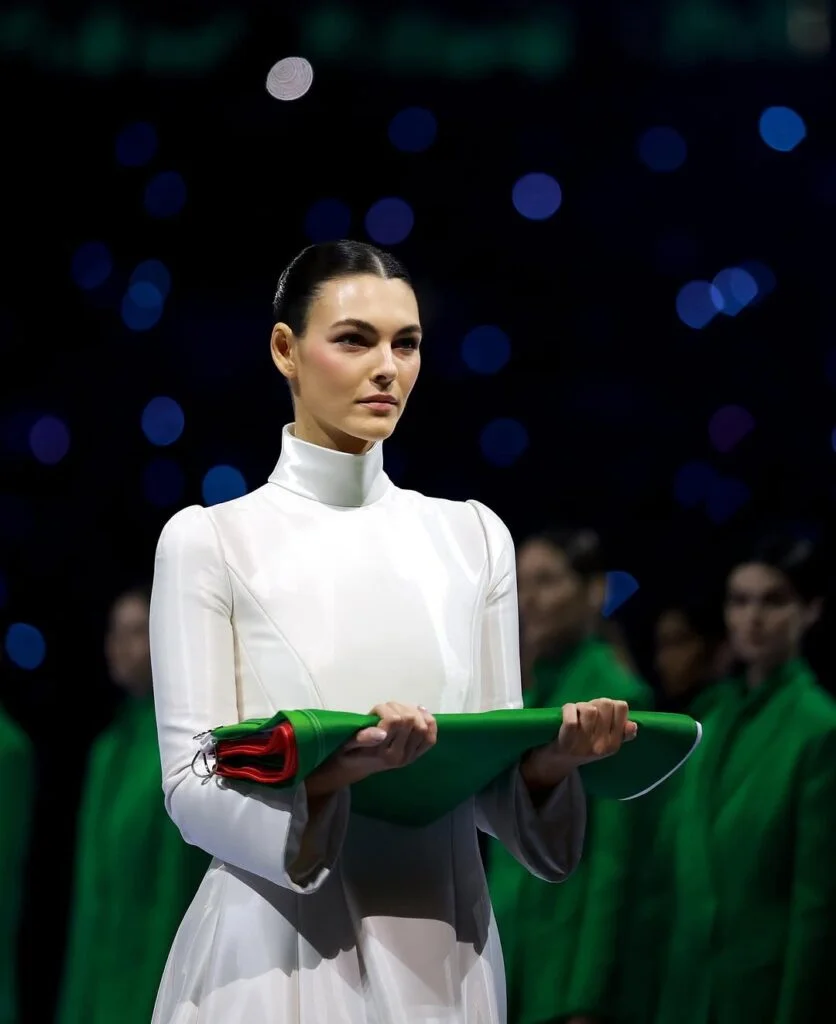 ویتوریا سرتی، سوپرمدل ایتالیایی و حامل پرچم کشورش، با لباسی سفارشی از Armani Privé در افتتاحیه المپیک زمستانی ۲۰۲۶ در میلان، توجه جهانیان را به خود جلب کرد.