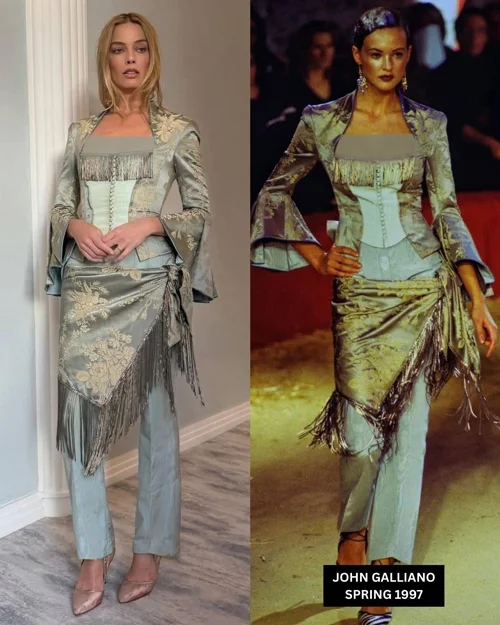 مارگو رابی در ایونت لندن با لباسی از کالکشن بهار ۱۹۹۷ جان گالیانو ظاهر شد و ترکیبی هنری از سبک نئو-ویکتوریایی و مد معاصر را به نمایش گذاشت.