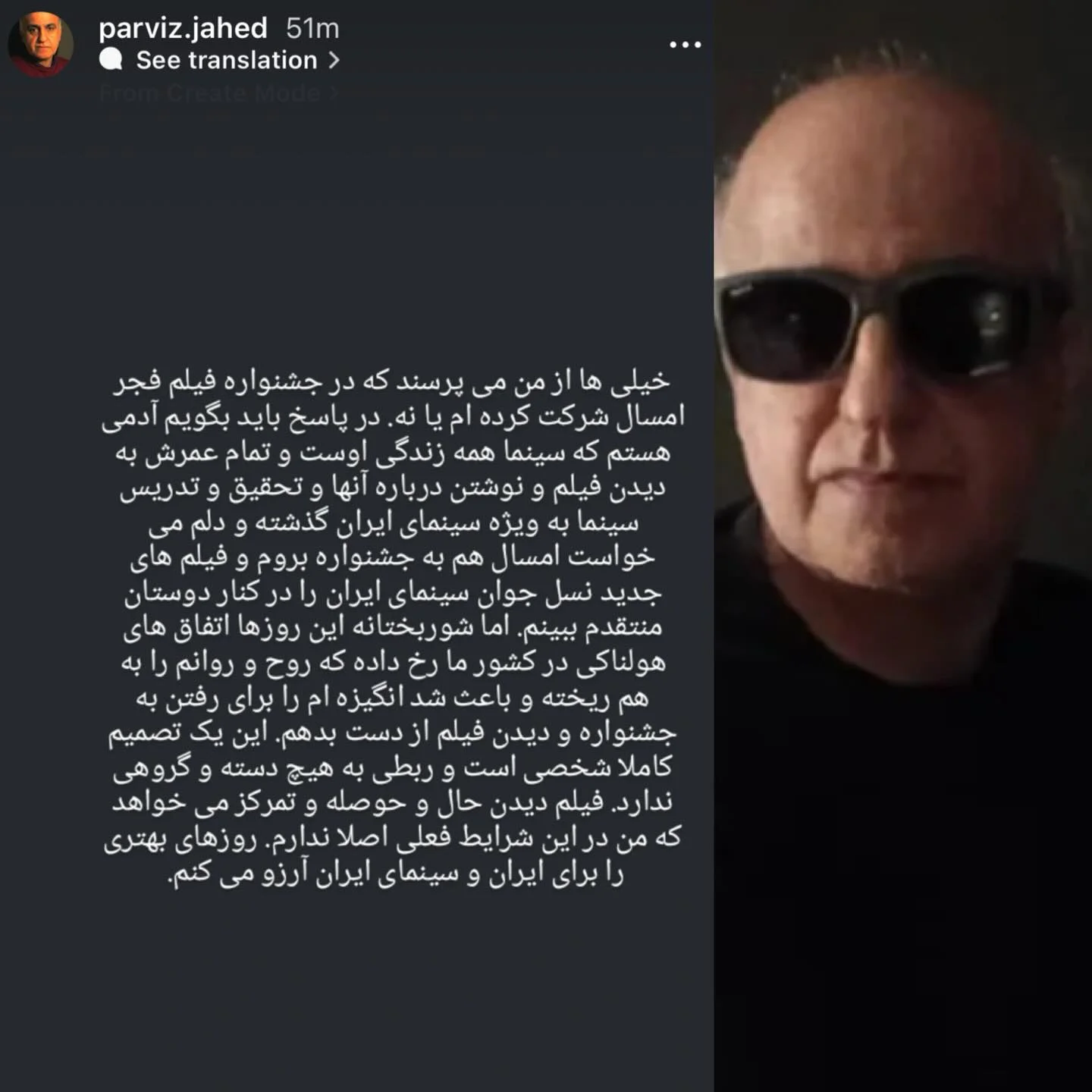عکس| توضیحات پرویز جاهد منتقد پیشکسوت سینما دربارهٔ عدم شرکت در جشنوارهٔ فیلم فجر