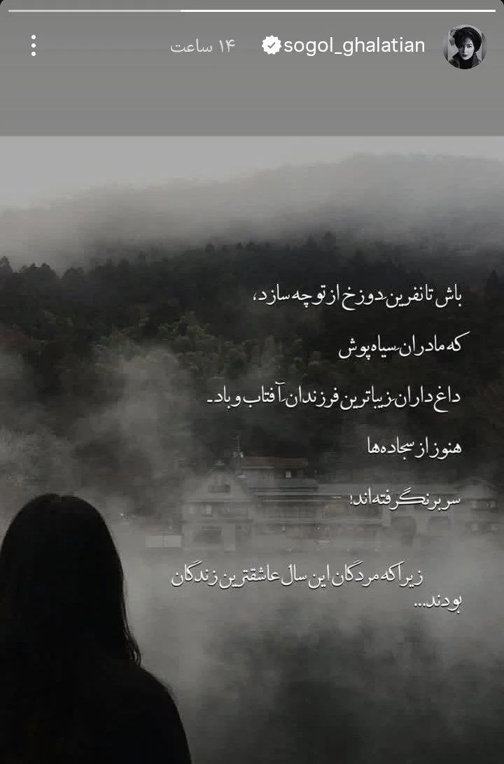 - سوگل قلاتیان با استوری که نفرین کرد؛ باش تا نفرین دوزخ از تو چه سازد ۱۴۰۴/۱۱/۲۱