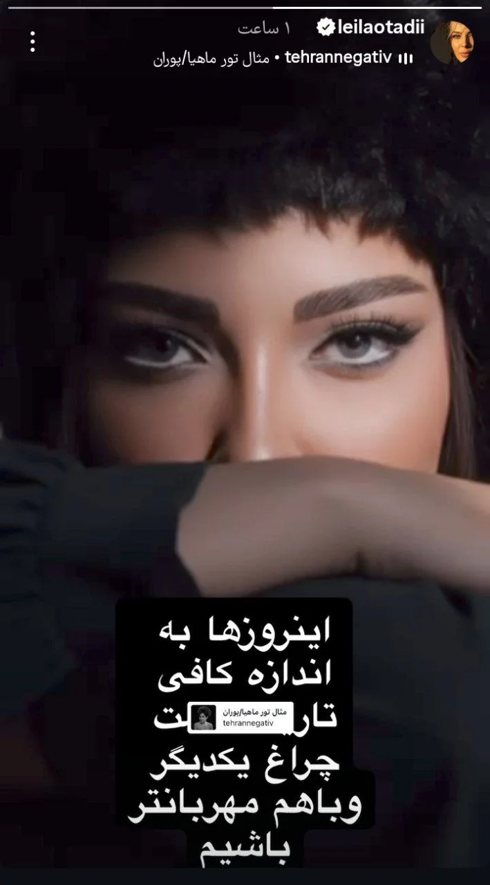 - عکس| استوری معنادار بهنوش بختیاری خطاب به مردم؛ همدرد باشید نه قضاوت کنید ۱۴۰۴/۱۱/۲۵