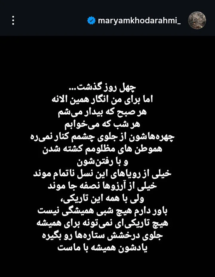 مریم خدارحمی با متن غمانگیزی برای چهلم هم وطنانش اشک مردم را درآورد.
