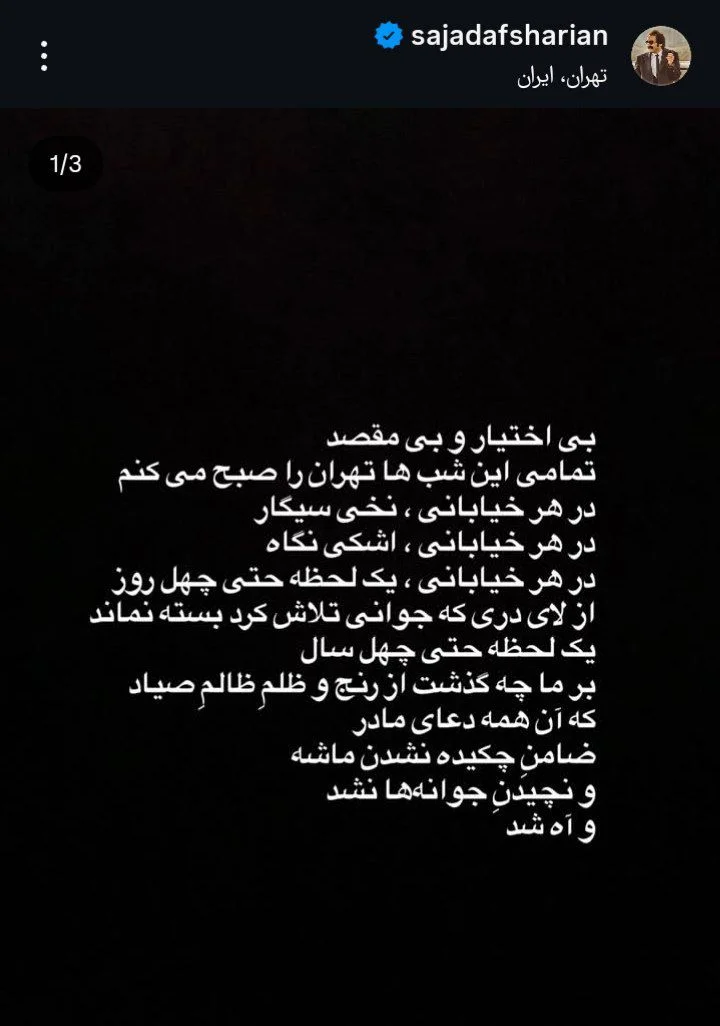 - فریاد بیپرده سجاد افشاریان در دل شبهای تهران؛ هزار و چهارصد و خون و امید ۱۴۰۴/۱۱/۲۹