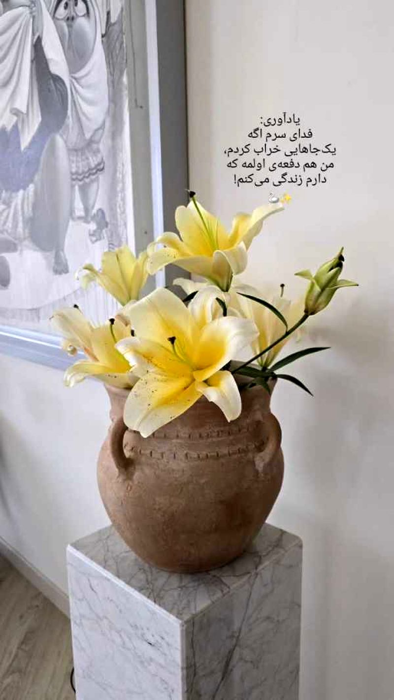 مینامختاری همسر بهرام رادان بازیگر معروف سینمای ایران می باشد. اخیرا وی از ترکیب زیبای گلدان و طراحی دیوارهای خانه اش رونمایی کرده است که خیلی خاص به نظر می رسد. او گل های گلدان را به رنگ لیمویی انتخاب کرده است. در قسمت زیر تصاویری از ترکیب زیبای تابلوی دیواری و گلدان سفالی مینامختاری را قرار داده ایم.