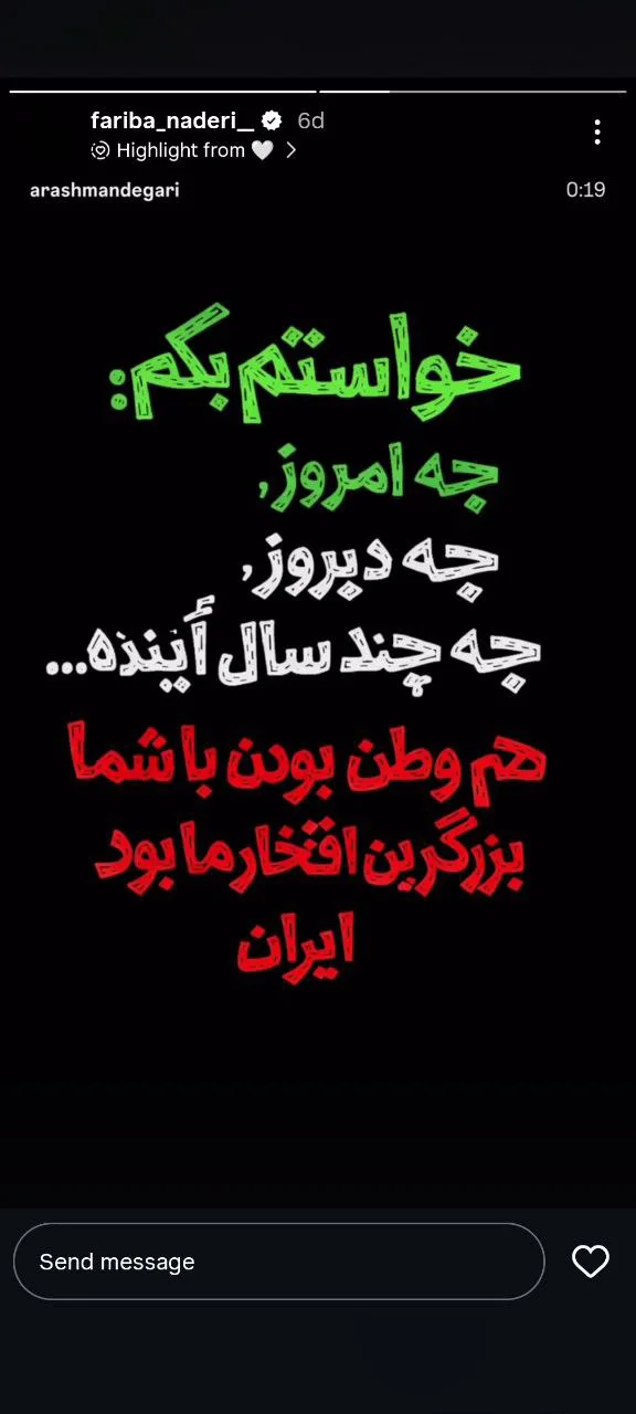 عکس | استوری خاص فریبا نادری: «هموطن بودن با شما بزرگترین افتخار ما بود»
