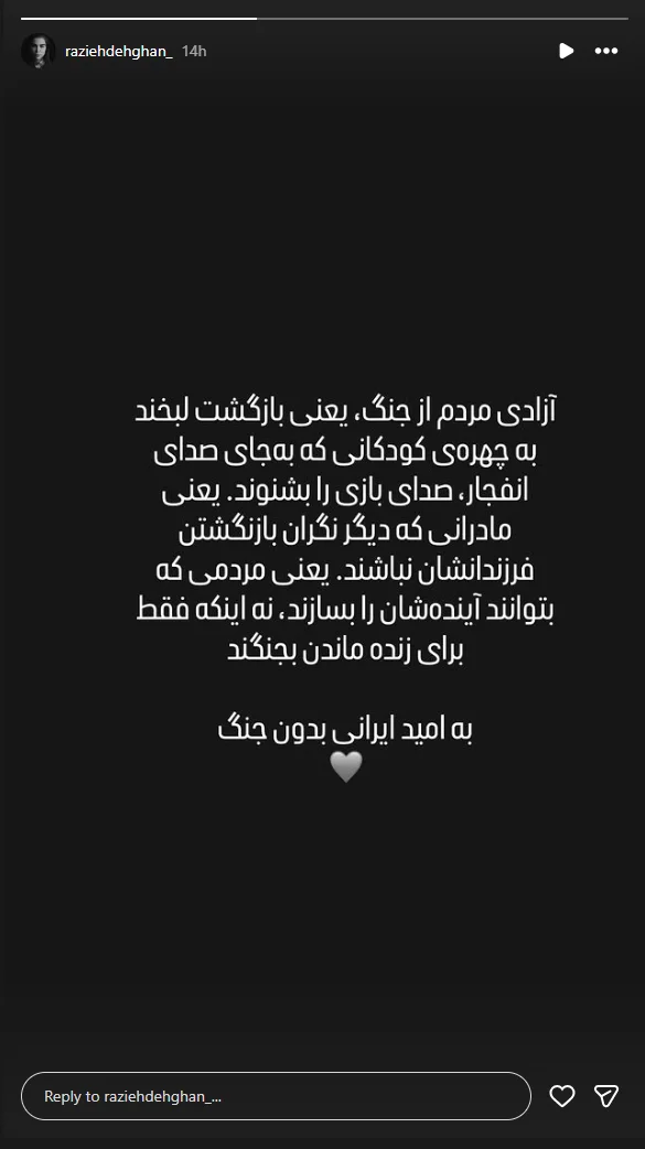 راضیه دهقان، بازیگر سینما و تلویزیون و بازیگر نقش «شیدا» در سریال «شغال»، با انتشار استوری در اینستاگرام از آرزوی خود برای ایرانی بدون جنگ نوشت.