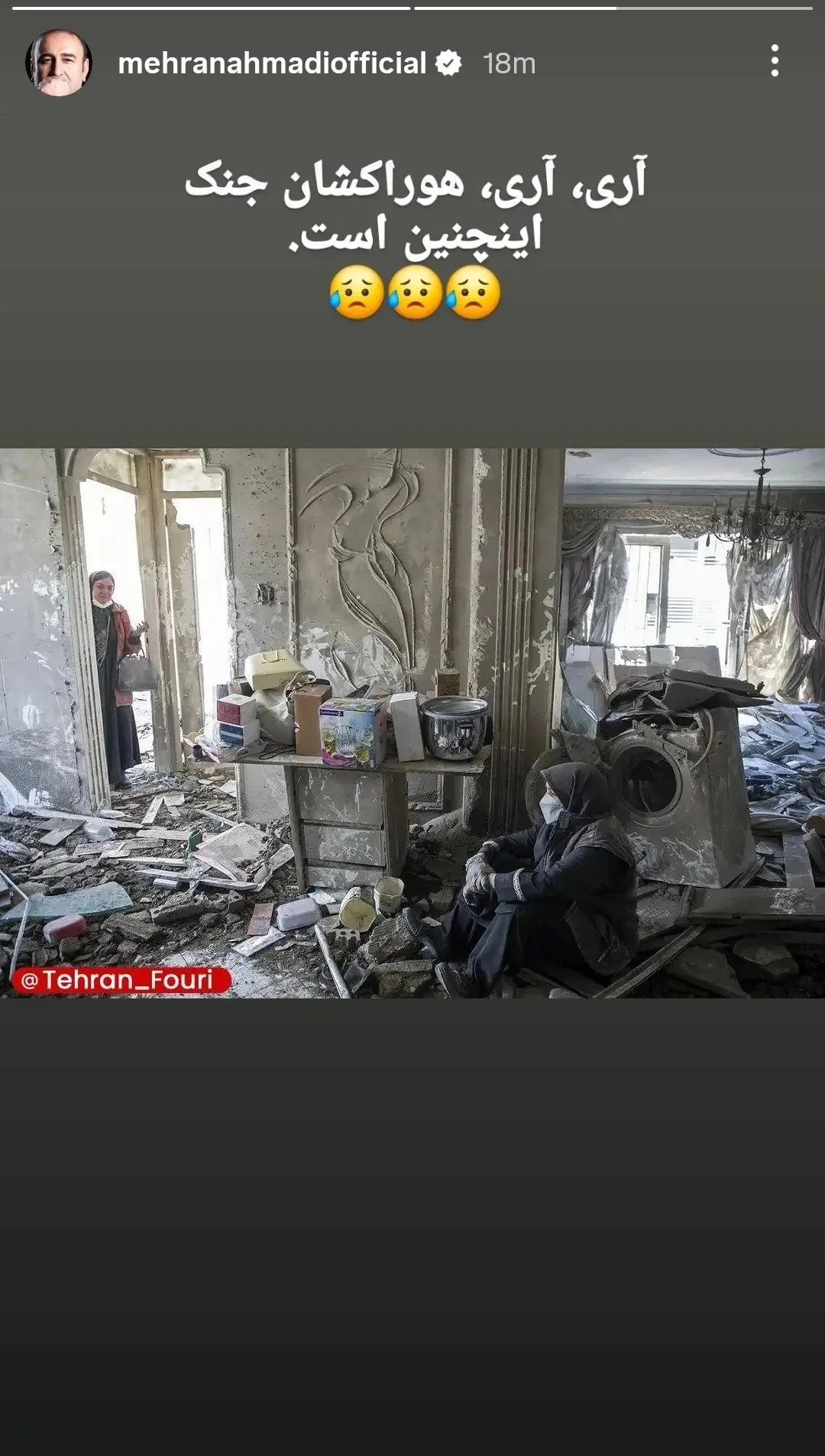 مهران احمدی، بازیگر و کارگردان سینما و تلویزیون، با انتشار استوری جدیدی در صفحه شخصی خود، نسبت به شرایط ملتهب منطقه و سایه جنگ واکنش نشان داد. او در این پیام با زبانی تلخ و گزنده، کسانی را که برای وقوع درگیریهای نظامی ابراز خوشحالی میکنند، هدف نقد قرار داد.