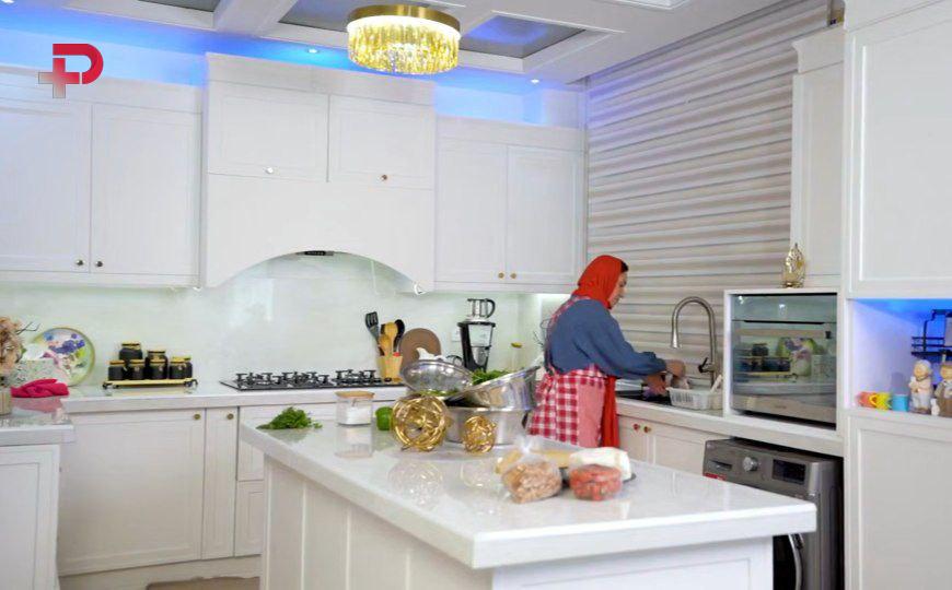آشپزخانه سفید، تیوی وال و مبل خز خانه فلامک جنیدی در شام ایرانی را ببینید.