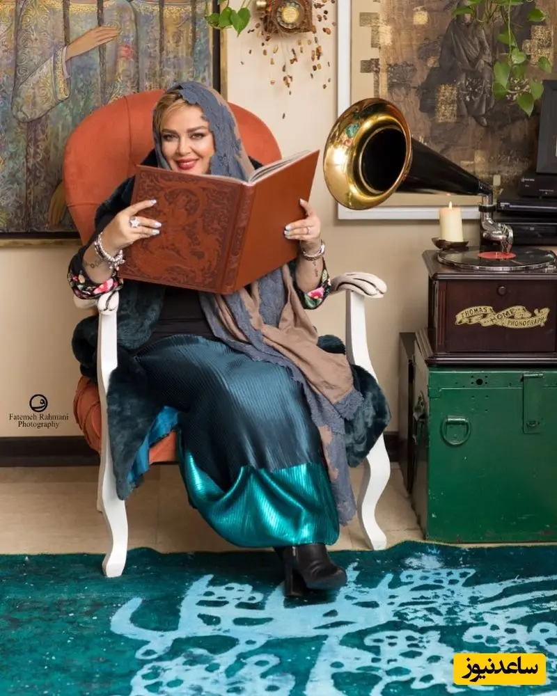 تصویری از بهاره رهنما را مشاهده می کنید که در گوشه هنری خانه اش نشسته است.