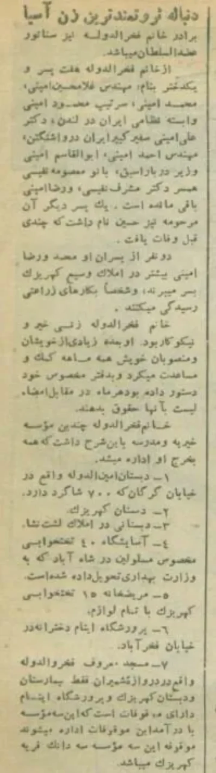 درایت اجتماعی، مدیریت اقتصادی و فعالیتهای عام المنفعه فخرالدوله در تاریخ معاصر ایران همیشه زبانرد بوده است. گزارش مجله تهران مصور شماره ۶۴۷ مورخ ۶ بهمن ۱۳۳۴ از زندگی فخر الدوله را بخوانید و عکسهایی از خانواده امینی تماشا کنید.