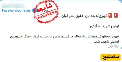 به گزارش سرویس سیاسی پلاس و به نقل از ساعدنیوز، از صبح امروز و درپی تجمع 200 نفره و حمله فرمانداری فسا، برخی کانال ها و رسانههای ضدایرانی دست به کشته سازی زدند.در یکی از این شایعات رسانههای ضدایرانی با انتشار تصویر زیر مدعی شدند: «مهدی سماواتی معترض 18 ساله در فسای شیراز به ضرب گلوله جنگی نیروهای امنیتی شهید شد./ اولین شهید راه آزادی»